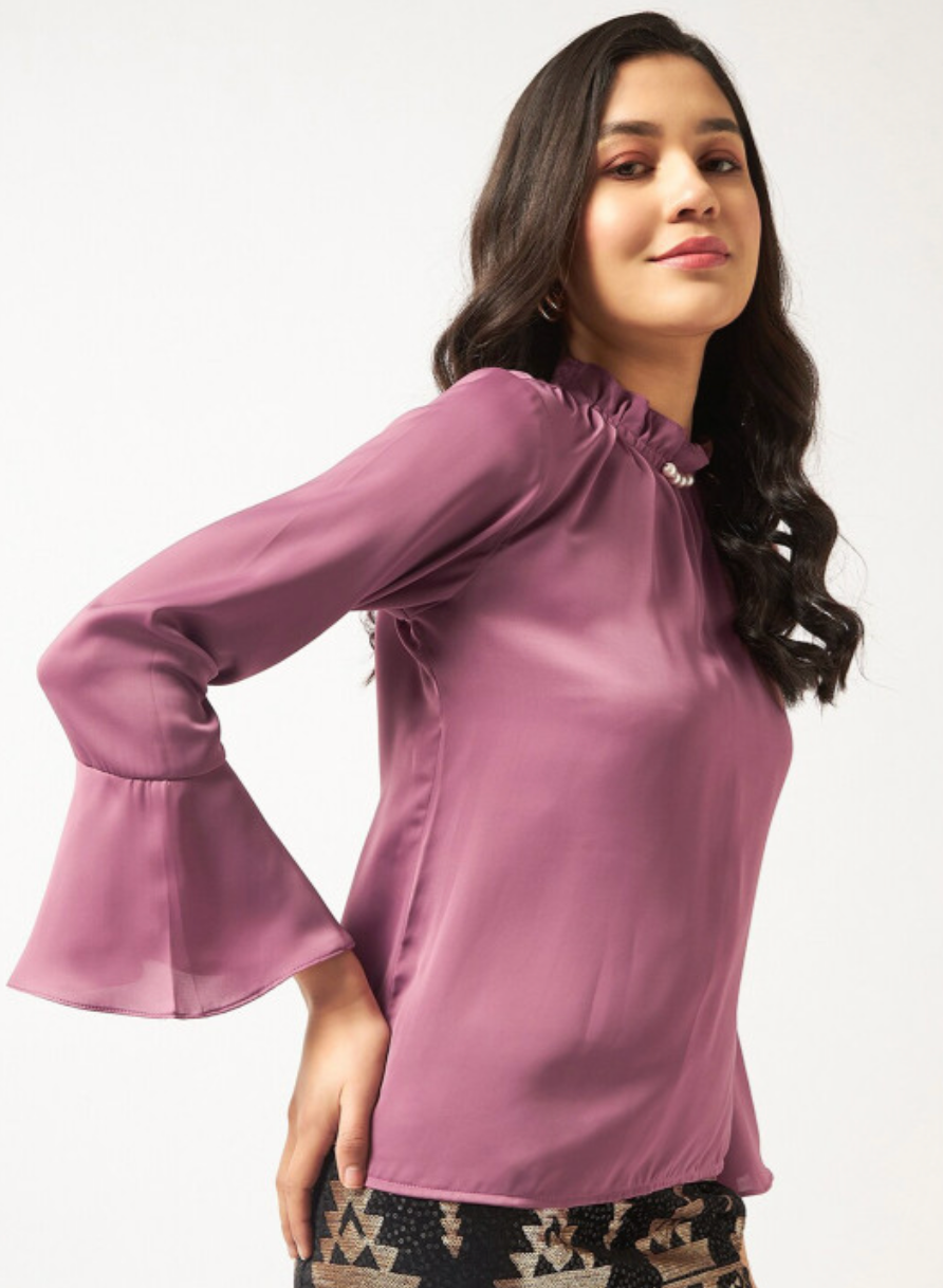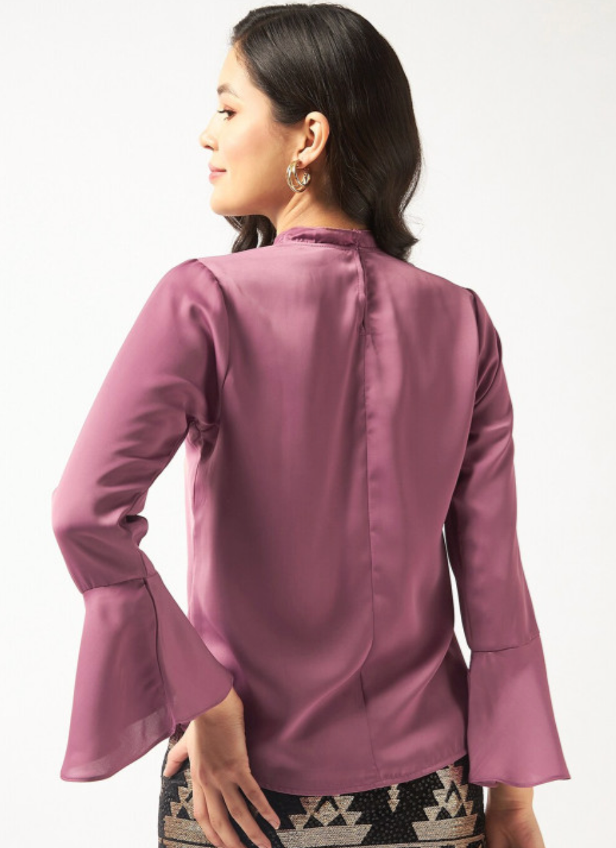 Taupe regular solid top with a high neck, long bell sleeves, and woven satin fabric.