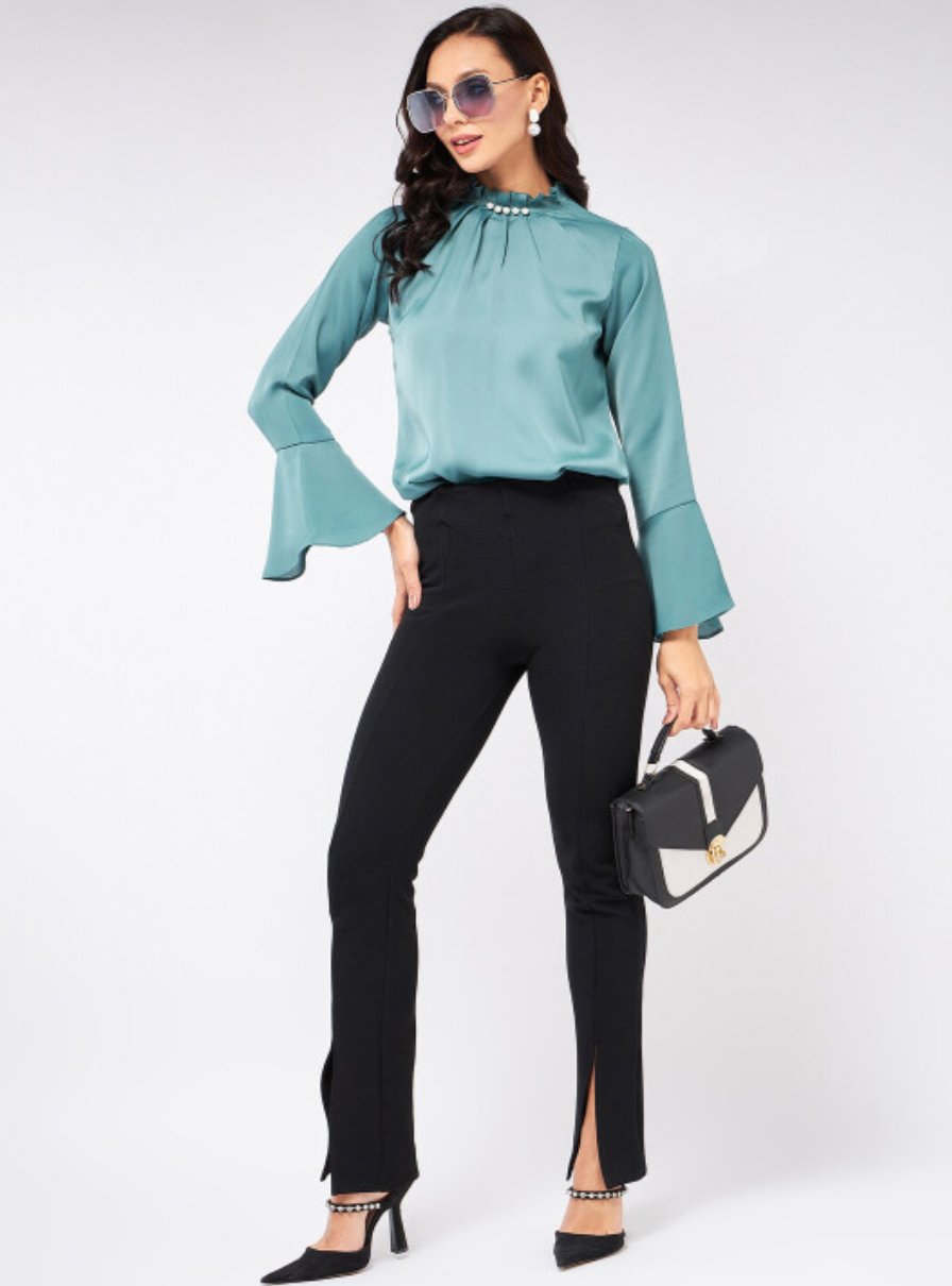 Green regular top, Solid, High neck, long, bell sleeve, Detail, Woven satin, Closure
