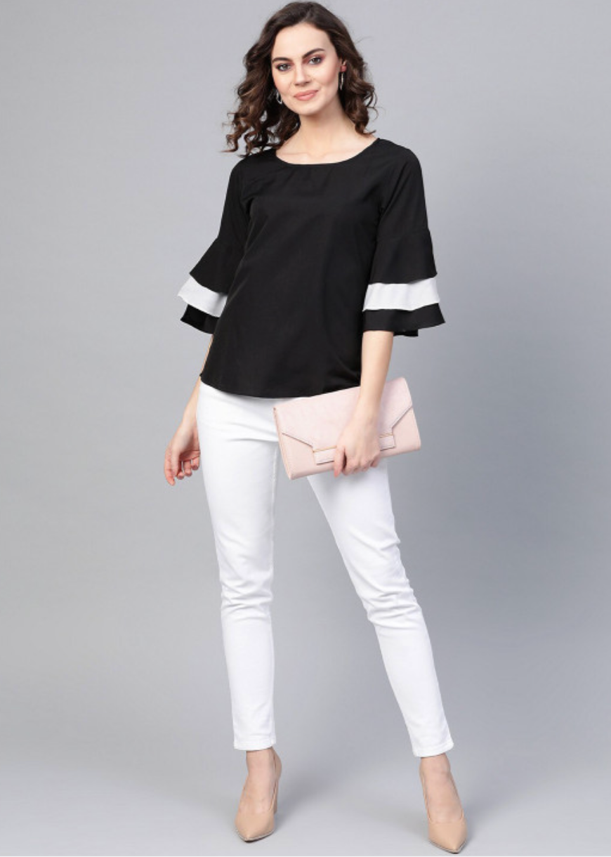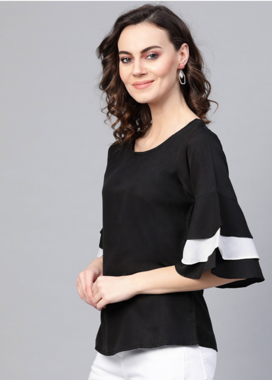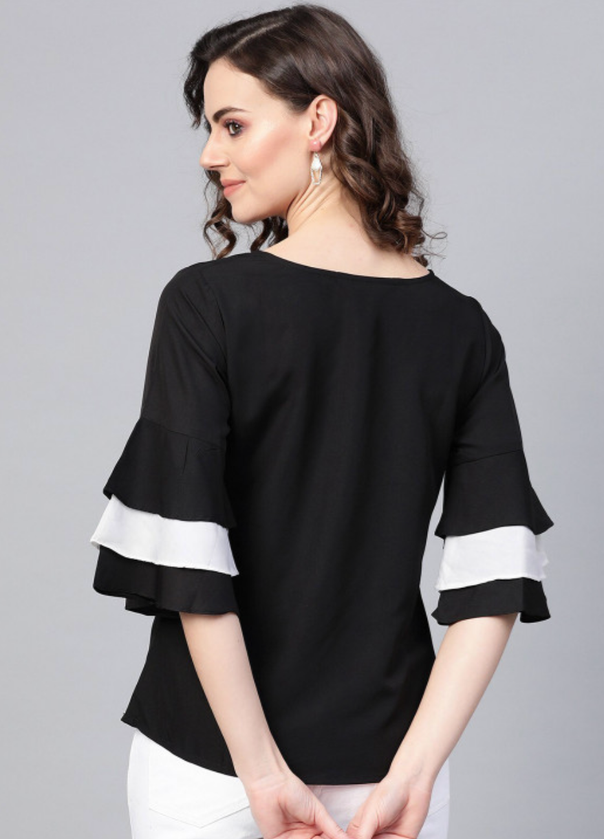 Black regular solid top with a round neck, three-quarter flared sleeves, woven crepe fabric, and closure.