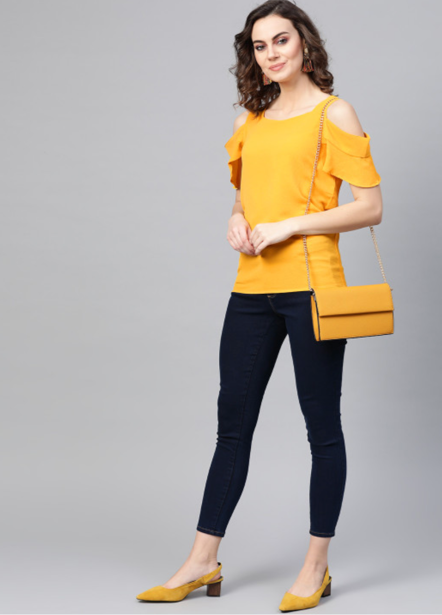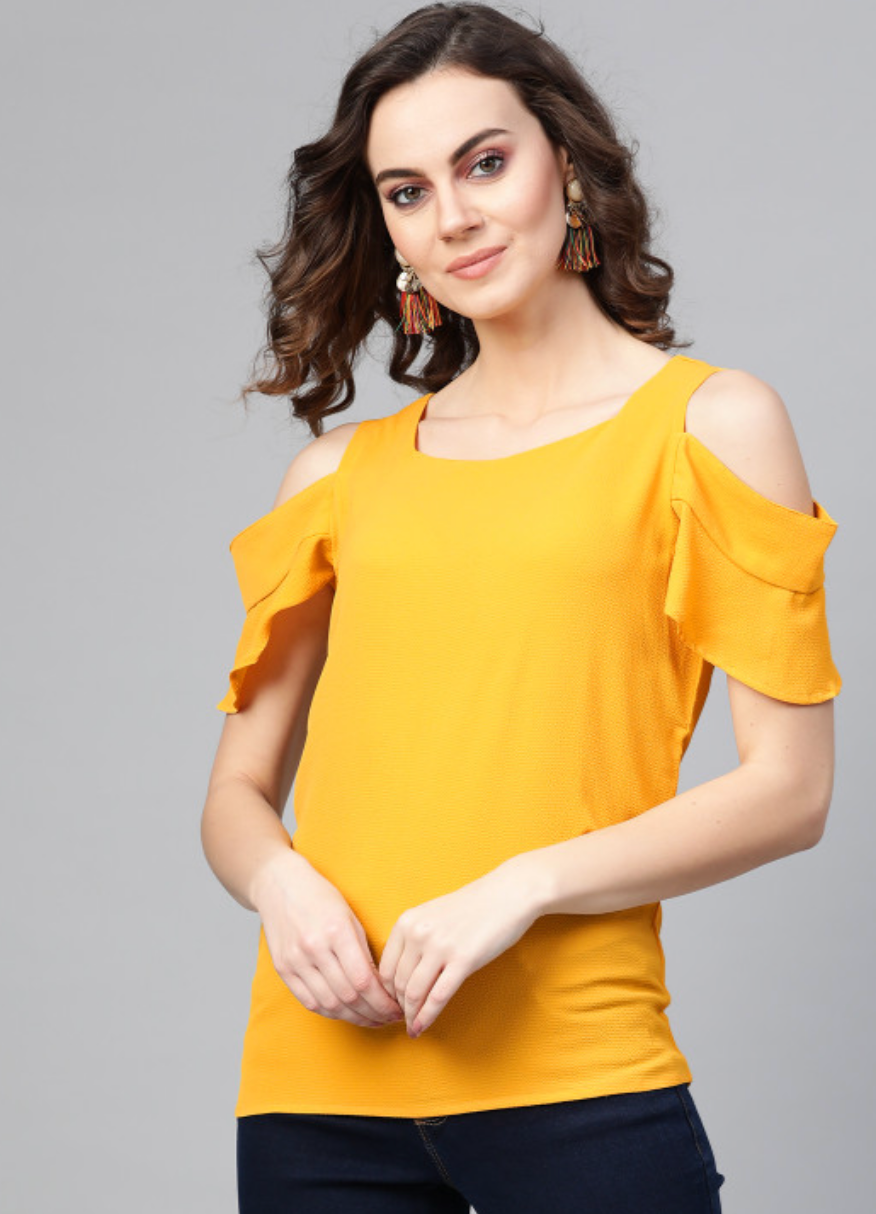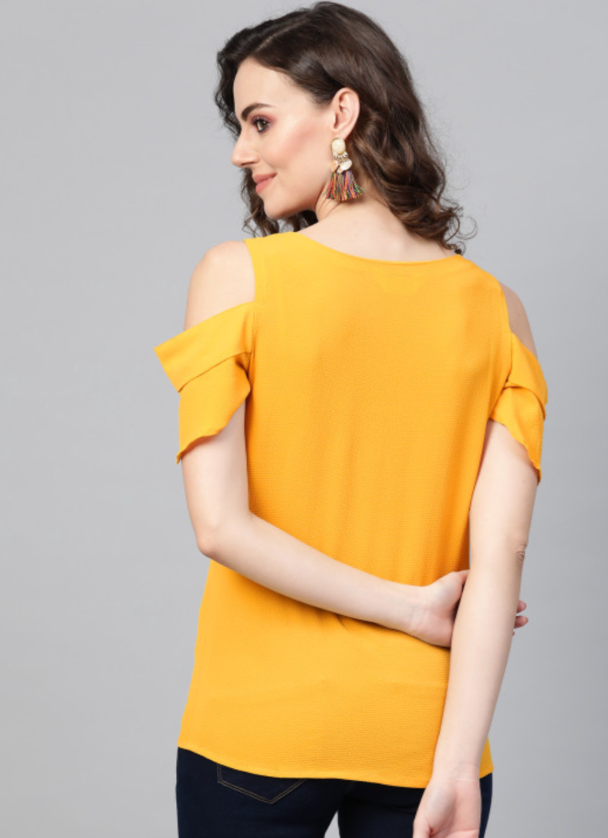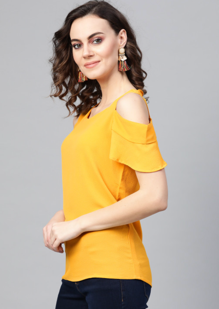 Mustard yellow solid knitted cold-shoulder top, has a round neck and short sleeves